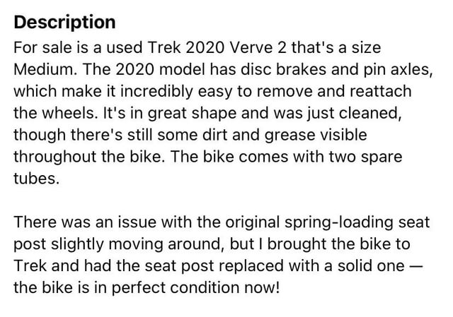 私はこのオプションを Facebook マーケットプレイスで見つけたのですが、このバイク (品質が良いと思われる場合) と価格について皆さんの意見を聞きたいと思いました。販売者は 350 ドルを要求しており、私の住んでいる大都市から少し離れた場所にあるため、このバイクを入手するには遠出が必要です。このバイクを購入する前に尋ねてテストすべきことは何ですか? マーケットプレイスの写真と説明を添付します。ありがとうございます!