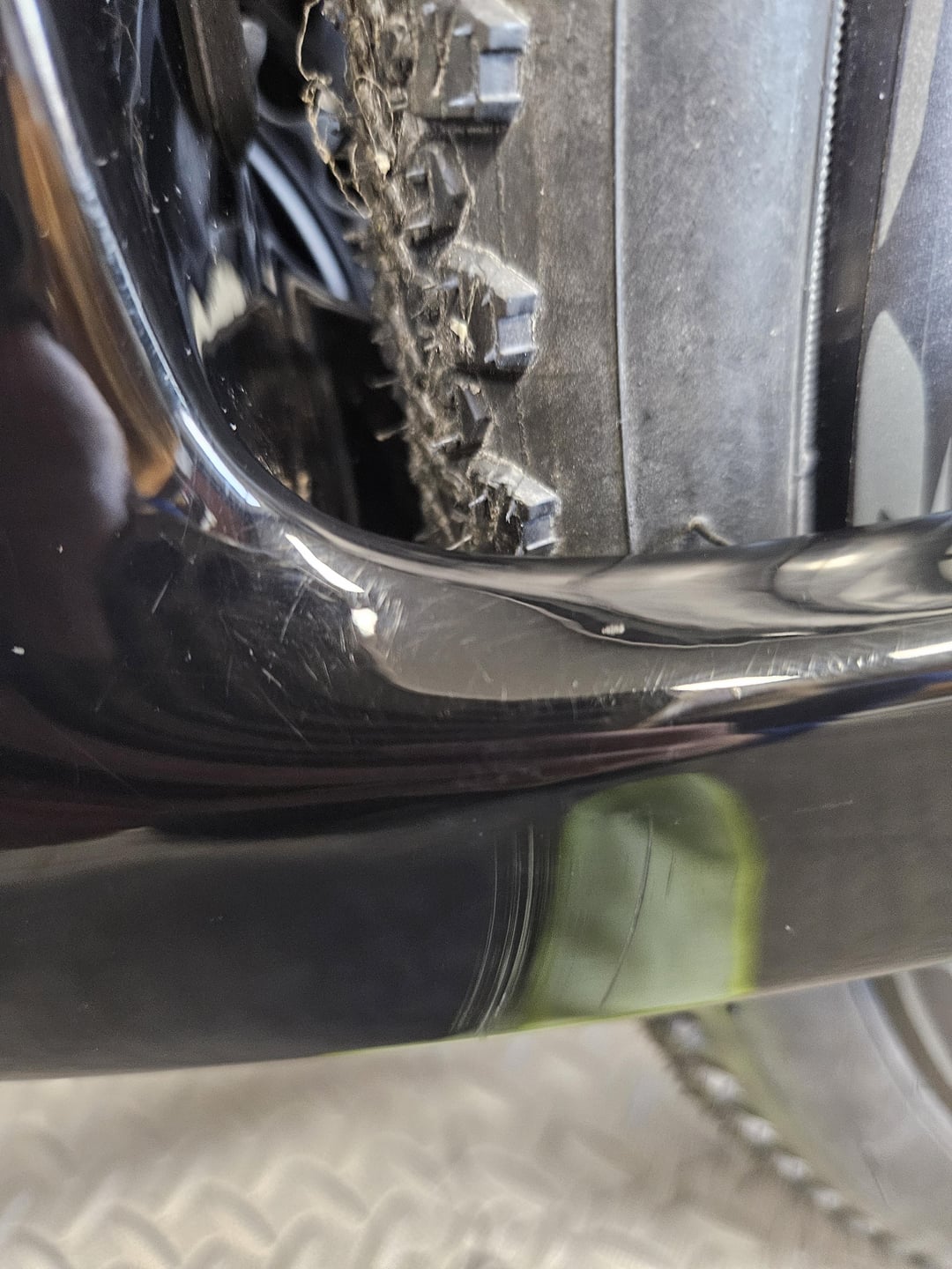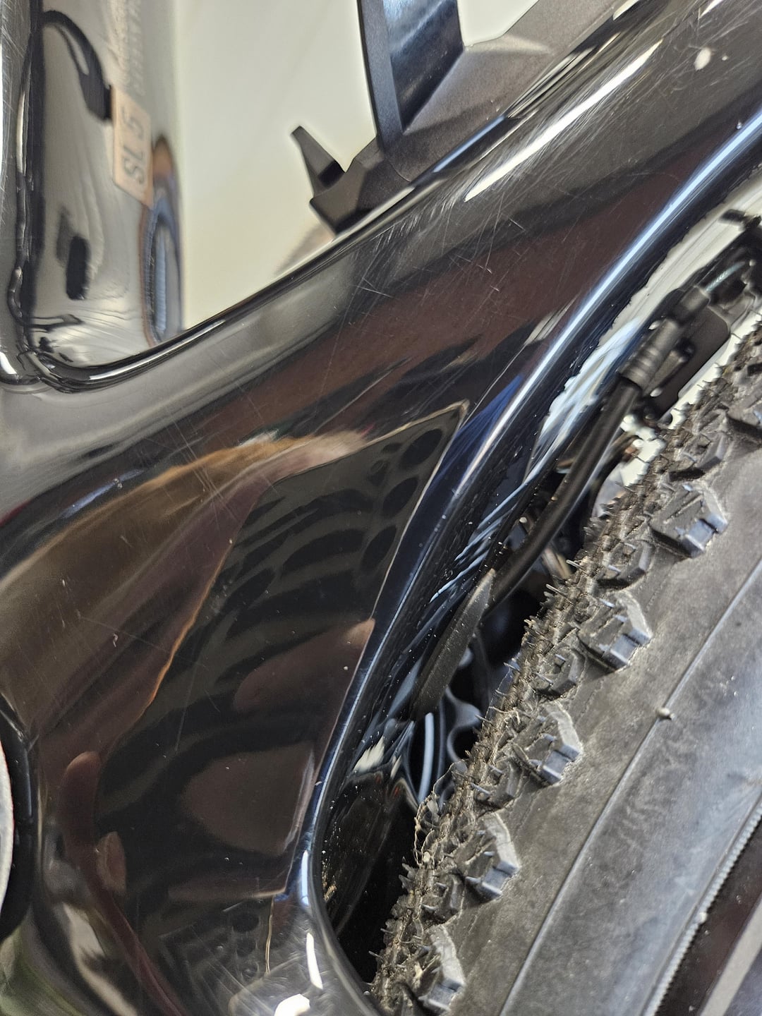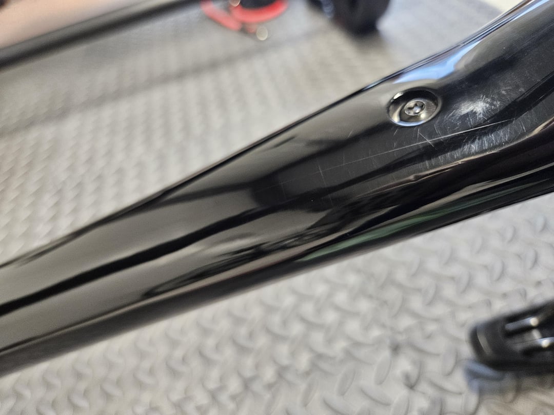 私の Domane SL5 は、9 ヶ月前に購入したものですが、バイク全体に小さな傷がたくさんあります。日光の下では、傷がはっきりと見えます。クリア ペイントにだけあるようです。触ってみないとわかりません。最後の写真には白い斑点も写っていますが、これも日光の下ではよく見えます。さらに大きな傷もいくつかありますが、これはブラック ペイントにあります。