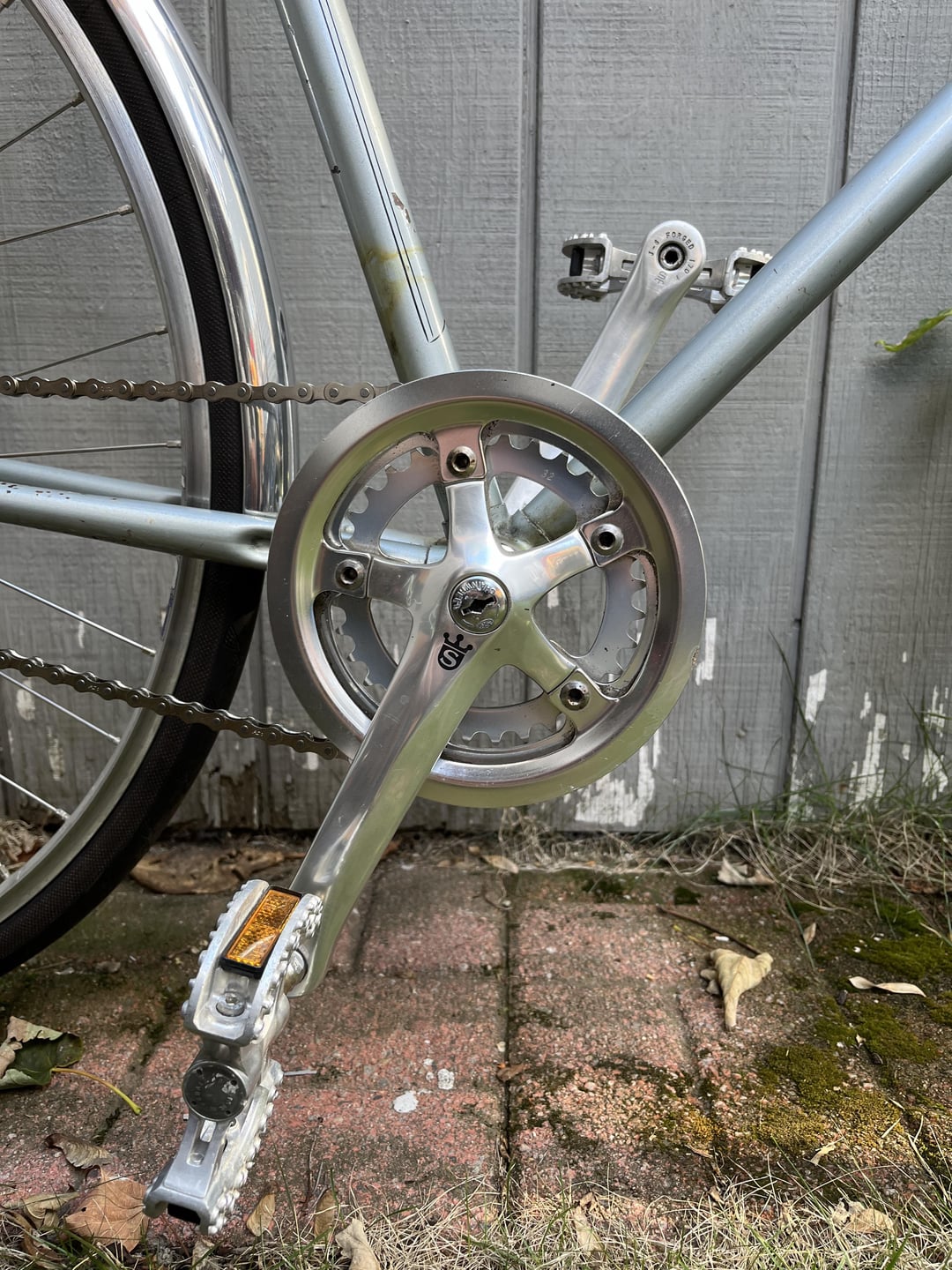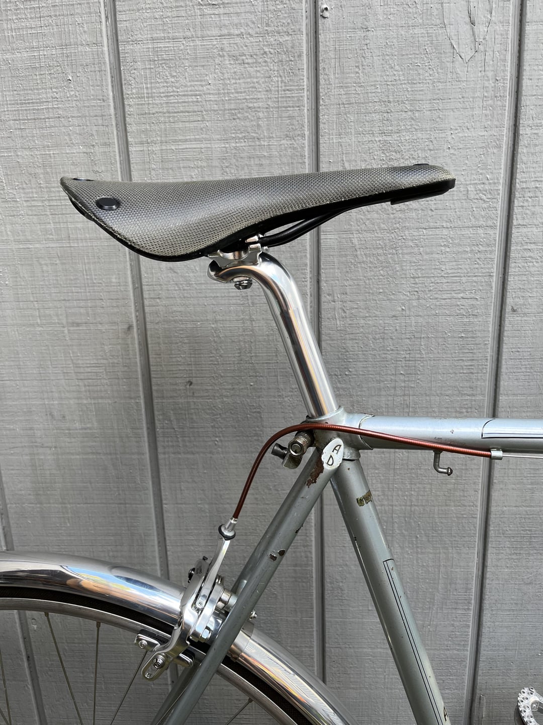 この夏の初めに、オリジナルのドロップバーとシマノ 600 グループセットを使って、他のシングルスピードと交換するために購入しました。 2007年からSchwinn Travelerのフレームを使っていましたが、私には大きすぎて、子供がいる今ではキッズシートを乗せると足が乗せられませんでした。