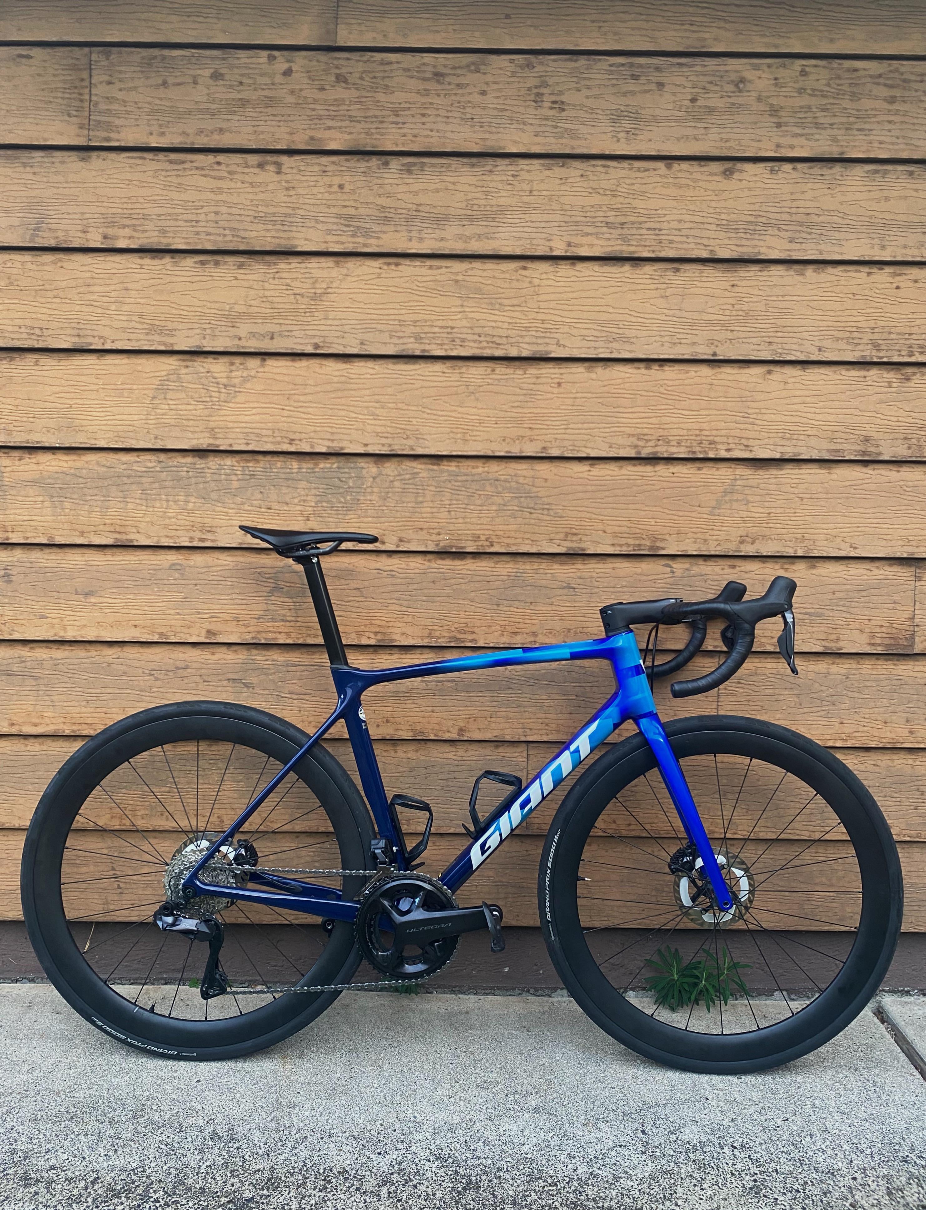 仕様: サイズ M/L TCR Advanced Pro 2024 フル Ultegra Di2 50/34、11-34 クランクアーム長 165mm 軽量自転車 AR46、DT Swiss 240 EXP、32mm GP5000 STR チューブレス。 Fizik Antares R1 サドル Giant Contact SL ステム -10 度 (110mm) Pro Vibe Aero コンタクト バー 40cm Framesandgear wahoo ヘッド マウント Ultegra ペダル Assioma Duo Shi パワー メーター ペダルに装着 ジャイアント ボトル ケージ (プラスチック/グラスファイバーだと思います?)