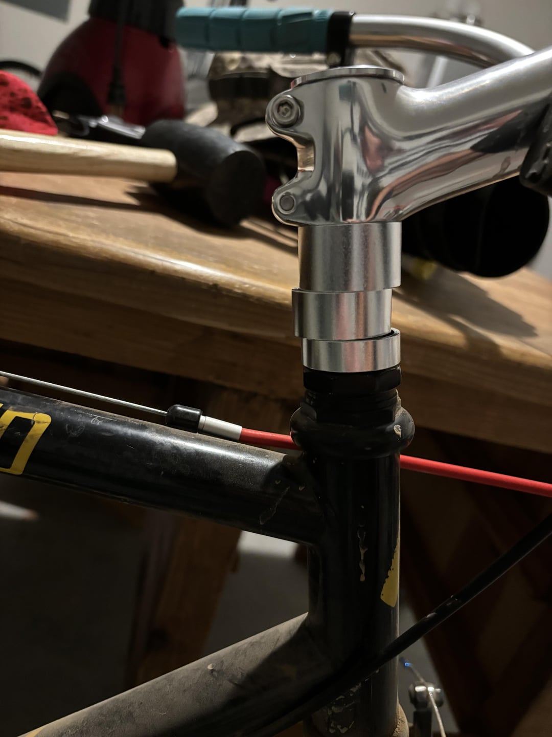 こんにちは!今年初めて自転車を作りましたが、その過程はとても楽しかったです。私が修正するのに苦労している問題の 1 つは、ヘッドセット スペーサーです。私は 1 から 1 1/8 インチのクイルステムをスレッドレスに変換するプロファイル設計を使用しています。現在、1 インチと 1/8 インチのヘッドセット スペーサーを使用していますが、時間が経つと外れてしまいます (写真を参照)。