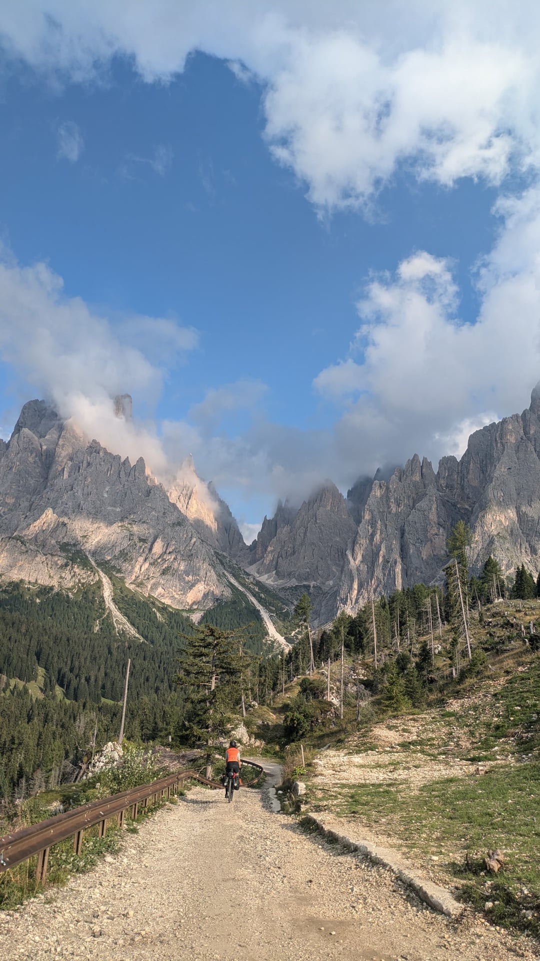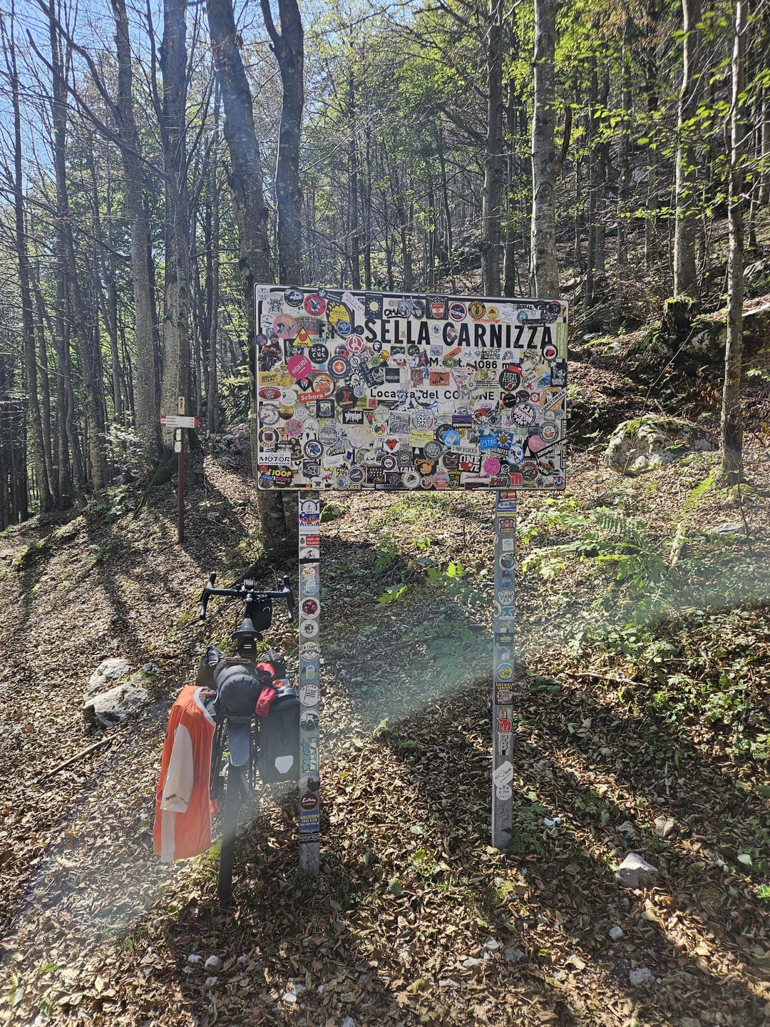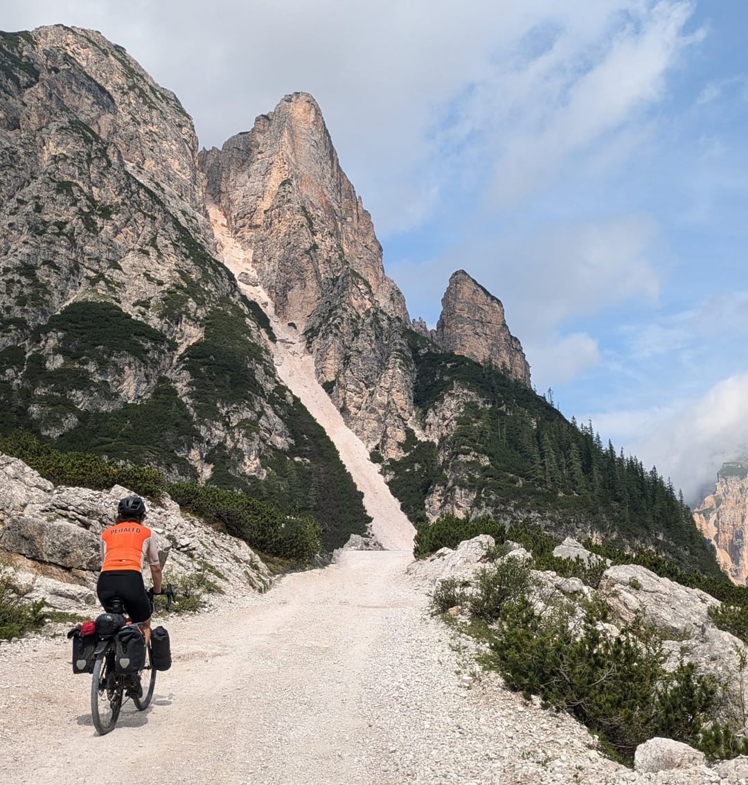 続いてはダイナミズムあふれるルートが続きました。私たちは人里離れた場所に奇妙に配置された蛇紋岩を通り抜け、最近の嵐のせいで通行止めになっていた人のいない峠を下る下りを楽しみました(幸いなことに、なんとかすり抜けました)。ヴァル・レージアのホテルの横にテントを張った後、スロベニア国境近くの難所パッソ・セッラ・カルニッツァに直面しました。勾配は19%にも達し、ドキドキするような一日の始まりでした。