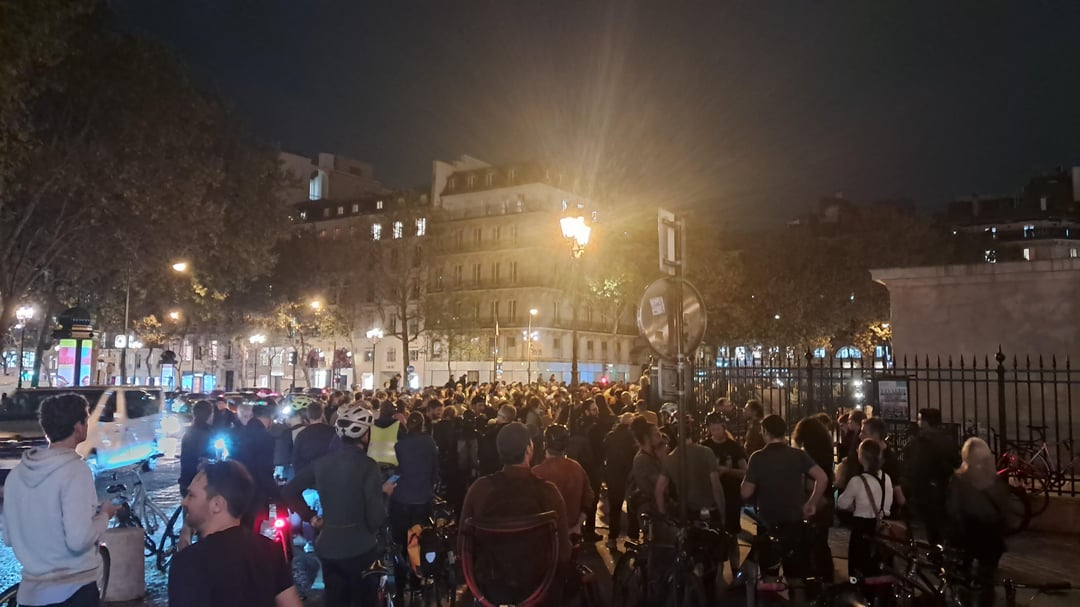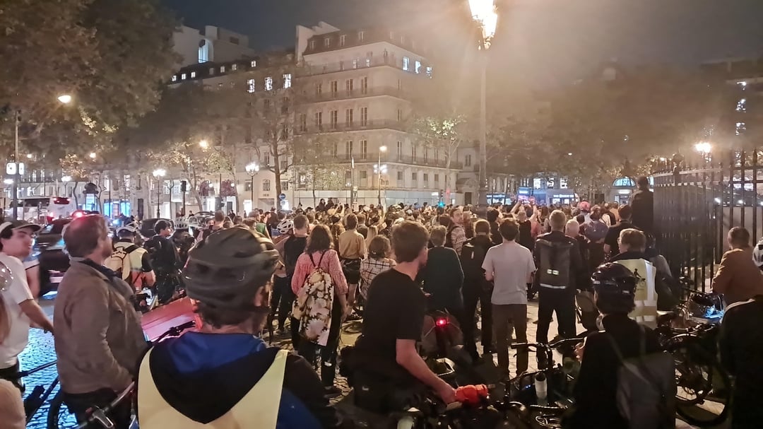 午後8時頃にはさらに多くの人や自転車がやって来たため、警察はマドレーヌ広場の集会の周囲のスペースを広げて私たちを交通から守る必要がありました。